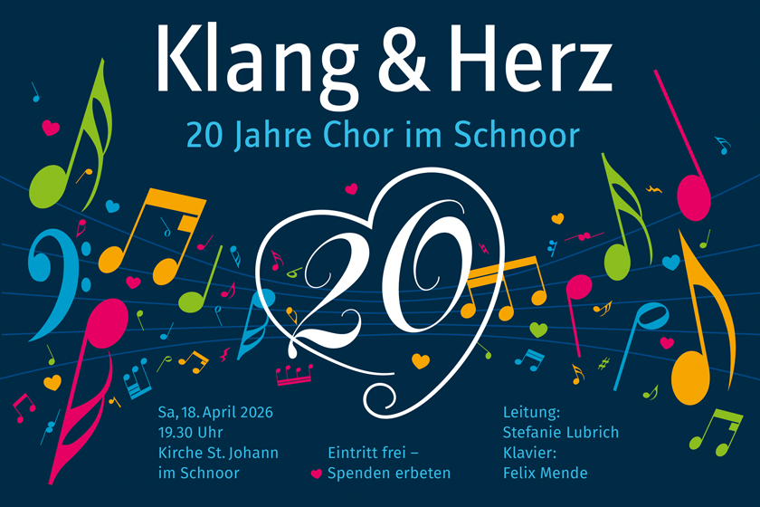 Der Chor im Schnoor tritt am 18. April um 19.30 Uhr in der Kirche St. Johann mit einem Konzertprogramm ›Klang und Herz – 20 Jahre Chor im Schnoor‹ auf.